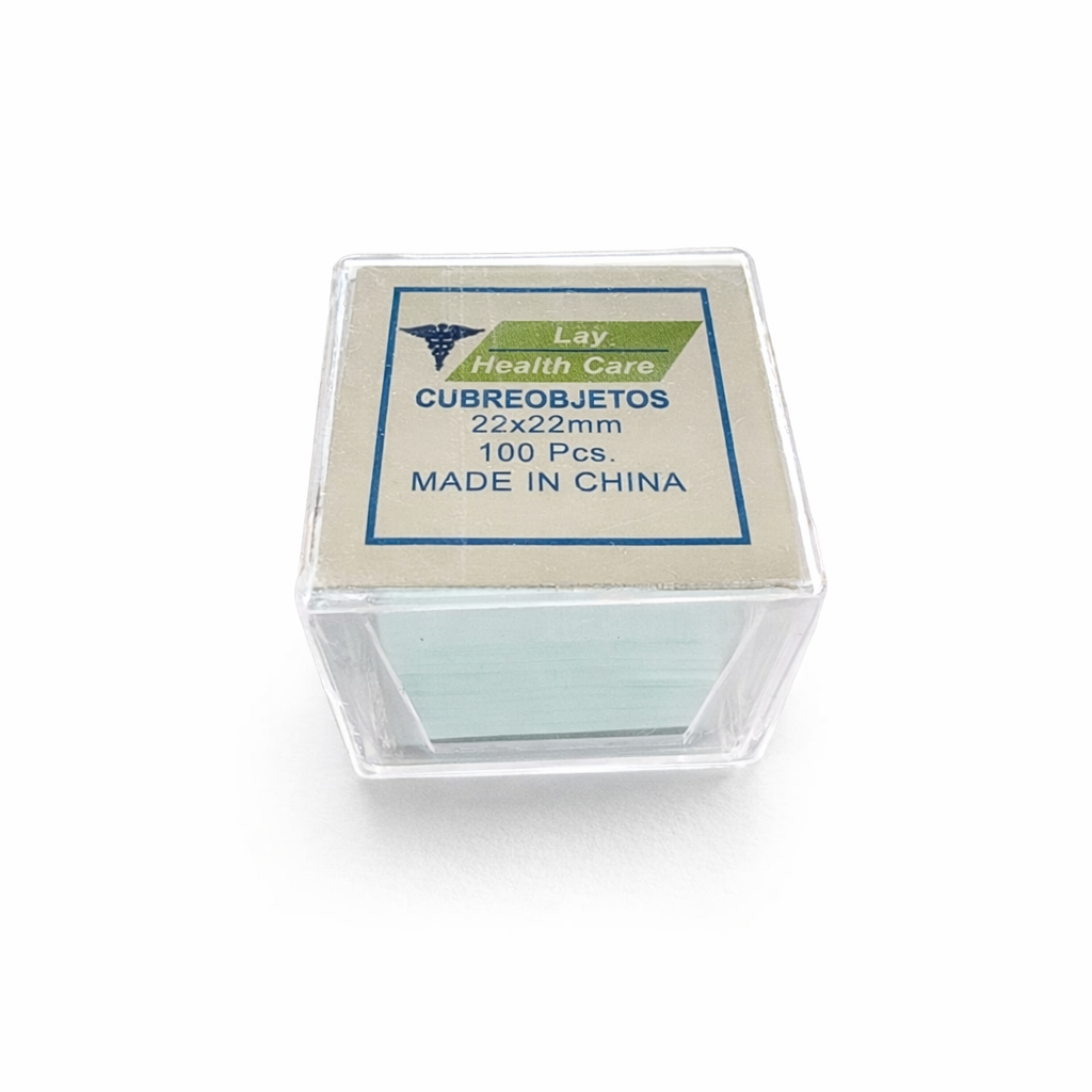 Los Cubre objetos Lay Health Care de material muy delgado transparente para que no afecte el estudio en el microscopio, de planta cuadrada, 22mm x 22mm.